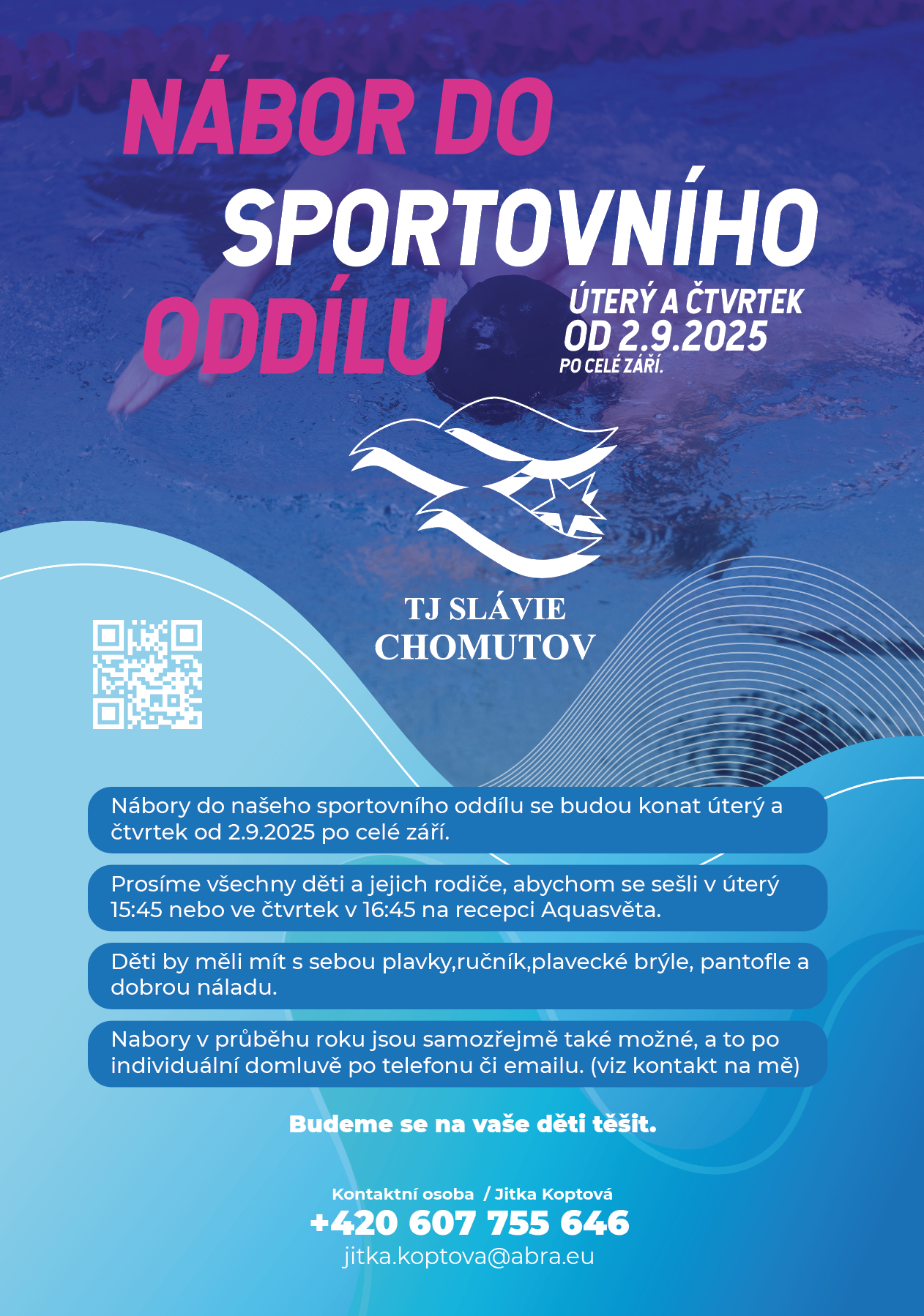 Nábory do našeho sportovního oddílu se budou konat vždy každý úterý od 15:45 a čtvrtek od 16:45 počínaje 2.9.2025 na recepci Aquasvěta v Chomutově a to během celého září 2025. (po domluvě možno stanovit i jiné individuální datum).
